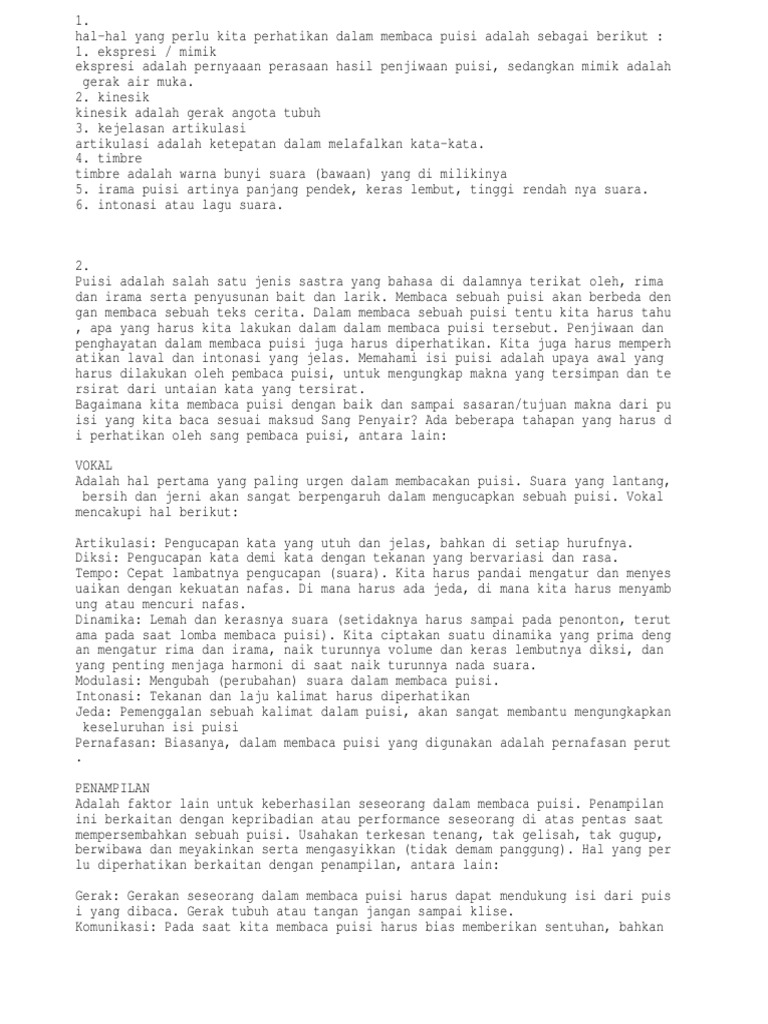 Dec 09 2016 Kedua hal tersebut setidaknya harus benar-benar kamu cermati agar pendengar bisa menikmati puisi yang kamu bacakan dengan baik juga pesan yang ada terdapat di puisi bisa tersampaikan. Karena merupakan peran pendukung agar puisi jadi makin matang ketika dibaca. Untuk bisa membacakan puisi secara baik dan penuh penjiwaan ada beberapa tips yang harus diperhatikan.