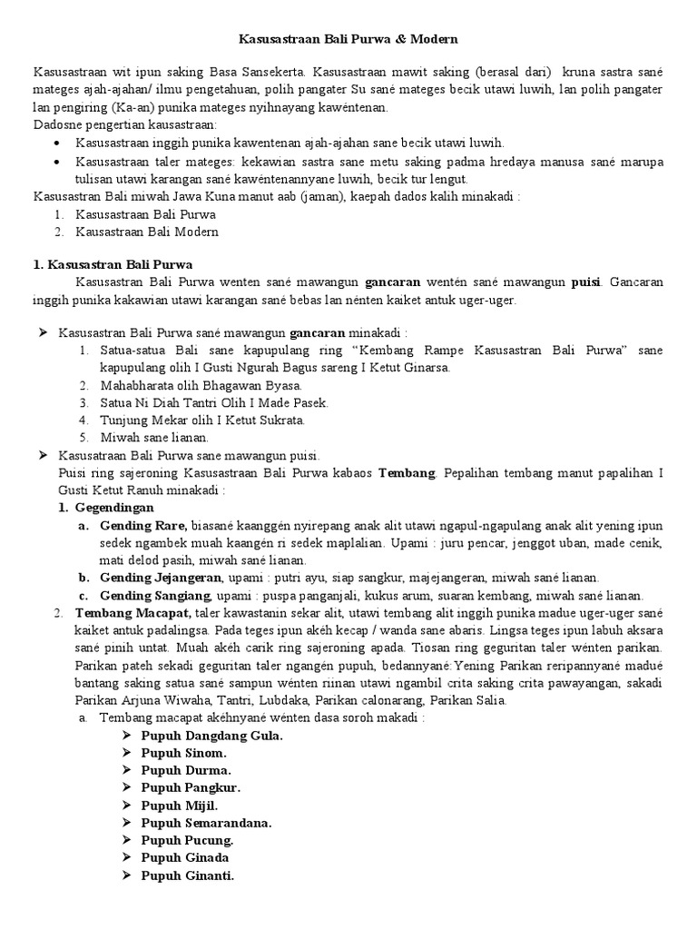Dija kaden langite endep suksmanipun sekadi anake sane mamilih genah wiadin pakaryan sane kasengguh becik pacang. Kasusastraan Bali Purwa Inggih punika kasusastraan sane pinih riin wenten ring Bali mewasta Adi utawi kesenian Sastra Prajana utawi rakyat sane nenten kasuratang kemaon kerambang turun-temurun maurip rauh mangkin. KASUSASTRAAN BALI GURU BIDANG STUDY BASA BALI I MADE.