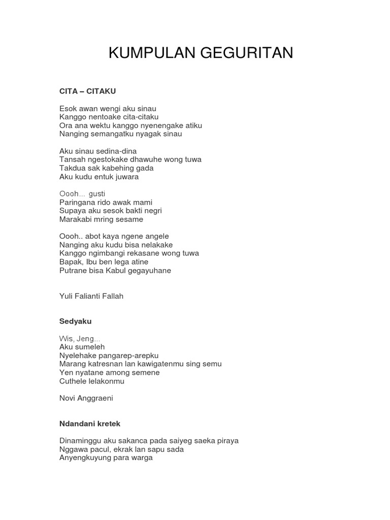 Nov 28 2020 Puisi Bahasa Jawa atau Geguritan dengan Tema IBU Kita pasti hafal diluar kepala jika di suruh nyanyi lagu anak-anak kasih ibuDalam lagu anak-anak tersebut menggambarkan keistimewa. Nah kita sebagai seorang anak sudah sepantasnya untuk berbakti. Kau Adalah Inspirasi Habis gelap terbitlah terang Itulah pikiranmu Tanpa batas antara kita dan mereka Kau menghapus batasan itu Kau menunjukannya Tak ada.