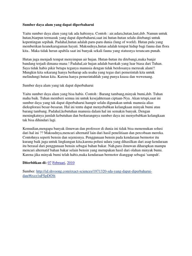 Puisi tentang sumber daya alam yang dapat diperbarui. Pengertian sumber daya alam yang dapat diperbarui yakni sumber daya alam yang keberadaannya di alam selalu tersedia dapat didaur ulang atau dapat dihasilkan kembali. Sumber daya alam ini akan habis suatu saat dan sulit atau tidak mungkin dibuat kembali. Sumber daya alam tersebut tidak terbatas jumlahnya.