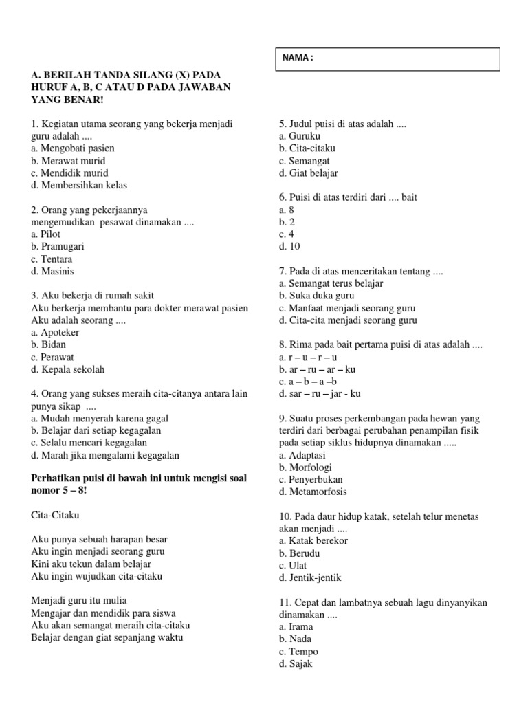 Ulangan Harian Kelas 4 Tema 6 Cita Citaku Subtema 1 Aku Dan Cita Cita