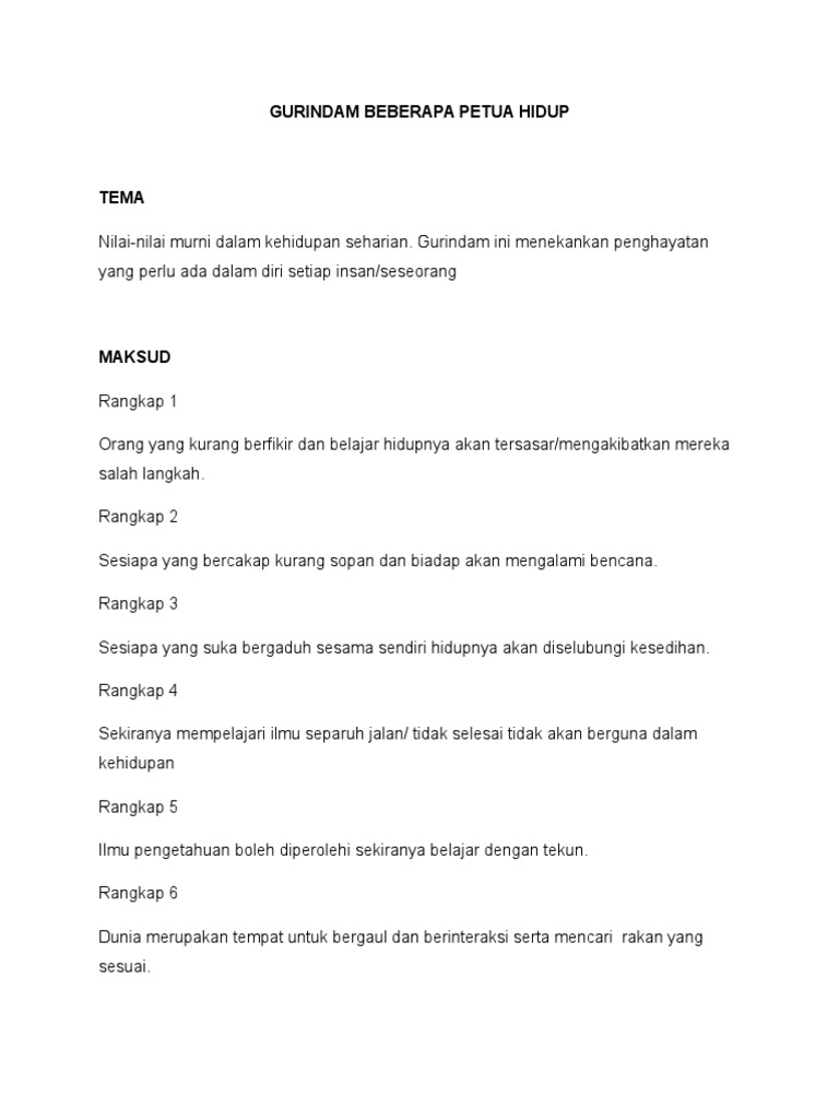 Mar 26 2020 Gurindam Beberapa Petua Hidup. BEBERAPA PETUA HIDUP GAYA BAHASA BENTUK GURINDAM kata arkaik - contohnya. It is the responsibility of each user to comply with 3rd party copyright laws.