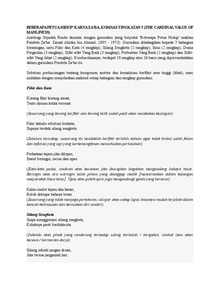 GURINDAM BEBERAPA PETUA HIDUP DRAFT. Sejadah Rindu Teks KOMSAS Tingkatan 5 Gurindam Beberapa Petua Hidup oleh Zaba.